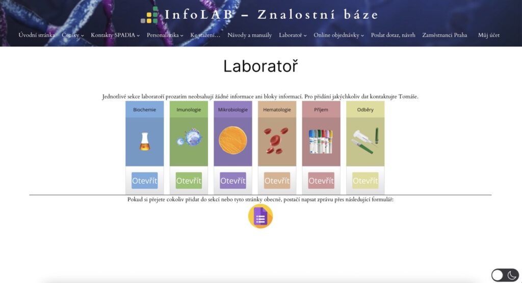 - Portál laboratoře – interní informační systém pro zdravotnickou laboratoř, zahrnuje personální informace, objednávky materiálu, návody a další dokumentaci.