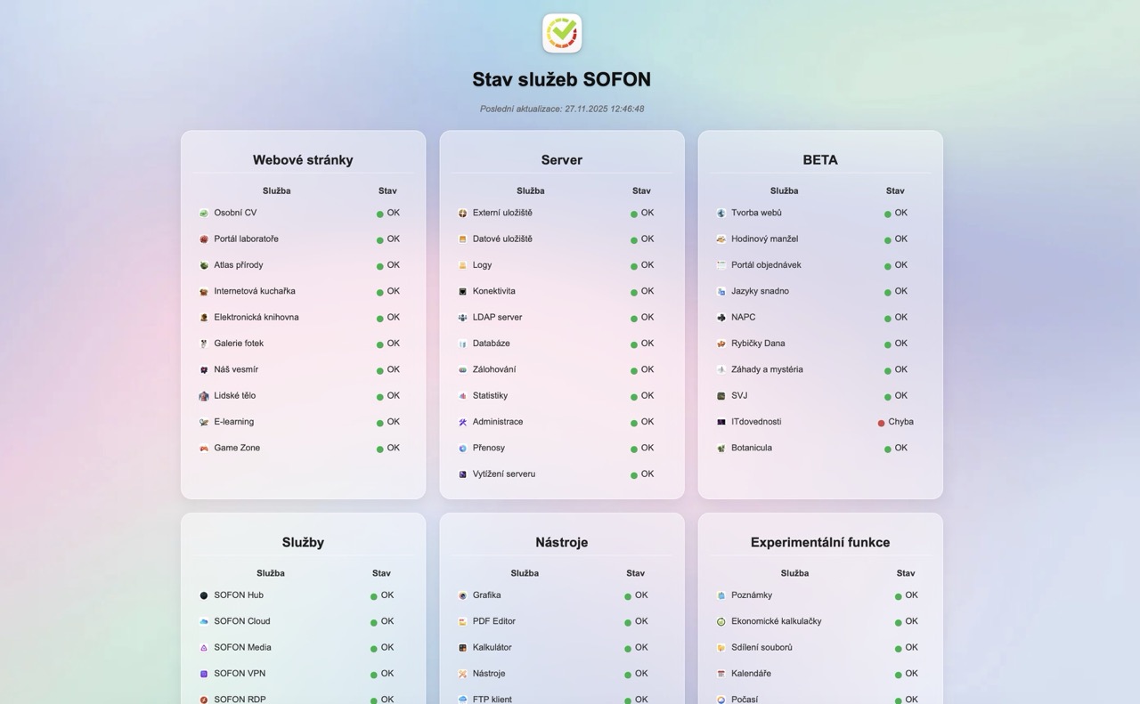 SOFON je můj dlouhodobý osobní projekt zaměřený na tvorbu tematicky zaměřených webových aplikací a online nástrojů. Jedná se o propojený ekosystém webových stránek a funkcí, které slouží jak k vlastnímu využití, tak i pro veřejnost nebo vnitrofiremní potřeby.